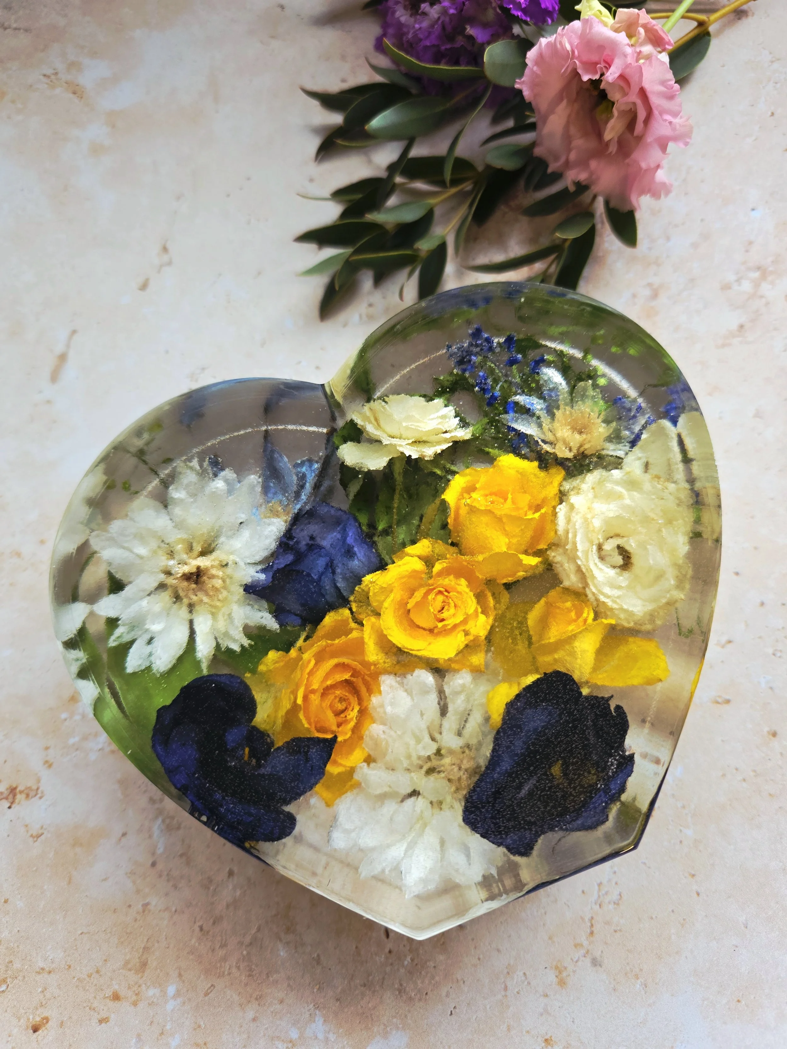 Please be aware that the the look and colour of your flowers preserved in resin will depend on the age and condition of your flowers when we receive them.